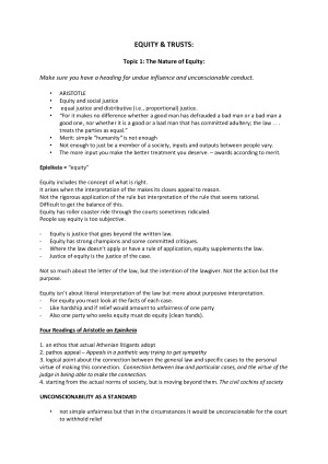 Topics: Topic 1: Nature of Equity Topic 2: Undue Influence and Unconscionable Dealings Topic 3: Fiduciary Relationships Topic 4: Equitable Remedies- Constructive Trust and Tracing Topic 5: Equitable Remedies- Specific Performance and Injunctions Topic 6: The Nature of a Trust Topic 7: Beneficiary and Trustee Rights and Powers Topic 8: Statutory Formalities and Complete Constitution of Express Trust Topic 9: Three Certainties Topic 10: Charitable Trusts