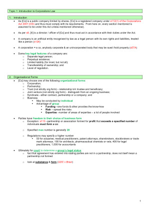 HD exam notes (87) for Corporations Law. Full comprehensive exam script with word-by-word answers to help with the exam. These combine lecture notes, weekly readings, and tutorial notes and topics covered include: 1. Introduction to Corporations Law; 2. Registration and its Effects; 3. Types of Companies; 4. Directors, Members and Corporate Decision-making; 5. The Constitution and Replaceable Rules; 6. Corporate Liability and Contracting; 7. Share Capital, Loan Capital and Dividends; 8. Corporate Governance and Directors Duties; 9. Members Remedies; and 10. Corporate Mortality. Any references to articles are references to the constitution we were given for our exam. I suggest the student uses the format and does the same for their exam.
