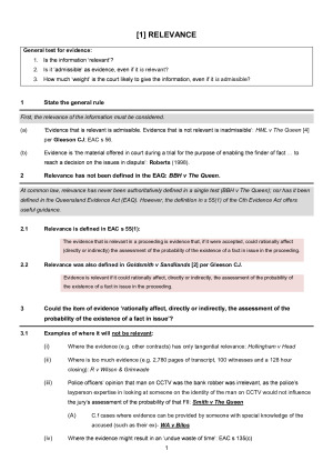 How were these notes made? These notes are the culmination of all the evidence tutorials, lecture notes, readings and cases for LAWS5216 (Law of Evidence) - all summarised and neatly packed into an exam answer structure. This structure makes it easy to take the notes into an open book exam and breaks down exactly what you need to address in the exam to get a 7. These notes were designed with the past practice exams in mind and based on five years' worth of exam feedback for a High Distinction mark. How do I use these notes? For ease of use, I recommend spotting all the relevant issues in the exam (eg relevance, privilege) and then tabbing the relevant pages of the notes so that you can refer to them easily while writing out your exam response. This will save time and ensure you address all the issues thoroughly. It would also be useful to do some of the key readings assigned to you in the tutorials and include your own handwritten annotations in the margins of my notes for more depth of analysis! The way you use these notes are entirely up to you, but it is an excellent starting point for what points you need to hit in the exam answer to get a high mark. What topics are covered? Topics covered: 1. Relevance 2. Burden of proof 3. Rules of Examination 4. Privilege and Immunities 5. Confessions and Admissions 6. Character and Propensity Evidence 7. Hearsay and Hearsay Exceptions 8. Sexual Offences 9. ID Evidence 10. Expert Evidence