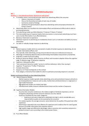 Includes notes from the prescribed readings Week 1: How Advertising Works: What do we really know? How advertising works: alternative situational and attitudinal explanations Spotlight on Digital Customer Engagement Integrating Marketing Communications: New Findings, New Lessons and New Ideas Unlocking the Power of Integrated Marketing Communications: How Integrates is your IMC Program? KPI’s and See-Think-Do-Care Framework Week 2: Possessions and the Extended Self The Self and the Brand The Elaboration Likelihood Model: Review, Critique and Research Agenda Word of Mouth and Interpersonal Communication: A Review and Directions for Future Research Harnessing the Science of Persuasion Influence Contiguous Week 3: Creativity in Advertising when It Works and When It Doesn't The Definition and Measurement of Creativity: What do we Know? Toward a general theory of creativity in advertising: Examining the role of divergence Briefing an Agency Constructing a Creative Brief Week 4: Advertising Appeals, Moderators and Impact on Persuasion: A Quantitative Assessment Creates a Hierarchy of Appeals What do consumers do emotionally with advertising? Week 5: Executing the Creative Seven Steps to Writing Great Copy The More You Learn Advertising Critique Example How to Think Deeply Metaphor in Advertising Beyond Visual Metaphor: A New typology of visual rhetoric in advertising Conceptual Blending in an Advertisement Guidelines for creating effective slogans Week 7: Media Planning Why Three Exposures May be Enough Effective Frequency: One Exposure or Three Factors? Advertising’s New Medium: Human Experience Week 8: Promotional Marketing Active Passive Stage and Triggers Communication and Promotion Decisions in Retailing: A Review and Directions for Future Research Visual Store Layout: an experimental comparison in the context of grocery retail Week 9: Competing on Analytics Getting Started with Google Analytics Learning Web Analytics Google Analytics Week 10: Click-Through Behaviour across Devices in Paid Search Advertising Paid search: The innovation that changed the Web Targeting college students on Facebook? How to stop wasting your money Say yes to Facebook and get your customers involved! Relationships in a world of social networks Consumers’ Responses to Facebook Advertising across PCs and Mobile Phones Good Native Advertising isn’t a secret Attribution Modelling in Digital Advertising