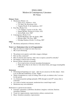 This document includes complete notes from ENGL10001 Modern & Contemporary Literature (through weeks 1-12) - I received a H1 with these notes. The primary texts discussed in detail within the notes include: • Modernism (Weeks 1-4) → James Joyce, Dubliners, 1914 → Eliot, The Wasteland, 1922 → Virginia Woolf, To the Lighthouse, 1927 • Post-War (Weeks 5-8) → J. D. Salinger, Catcher in the Rye, 1951 → Samuel Beckett, Waiting for Godot, 1953 → Sylvia Plath, Ariel, 1965 • Contemporary (Weeks 9-12) → Haruki Murakami, After the Quake, 2000 → Edward Albee, The Goat, 2000 → Edwidge Danticat, Brother I’m Dying, 2007