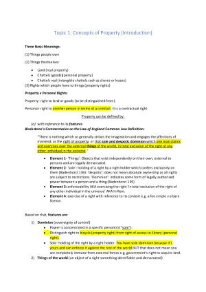 Covers ALL topics from week 1 till 11 except those who are not covered in the exam which include: Topic 3 Tenure Topic 4 Native title The rule against perpetuities (as indicated in PowerPoint Topic and Casebook pages 261-279). These notes are an effective mix of lecture notes and weekly readings which helped me immensely during my first batch of online exams, which resulted in a HD. Topics covered: Topic 1: Concepts of Property (Introduction) Topic 2: Fixtures and Possession Topic 5: Adverse Possession Topic 6: Doctrines of Estates Topic 7: Leases Topic 8: Equitable Leases Topic 9: Easement Topic 10: Restrictive Covenant (RC) Topic 11: Mortgages A table of content is used for easier navigation x