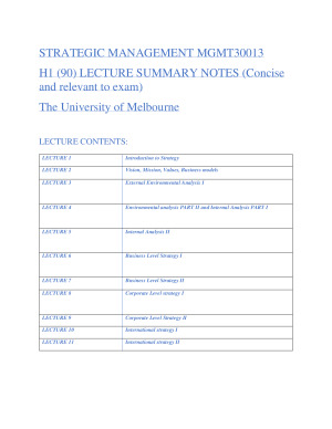 ✅Concise and relevant notes for Strategic Management ✅Covers all topics in detail and simplifies concepts to boost understanding Covers the following topics in detail: -Introduction to Strategy -Vision, Mission, Values, Business models -External Environmental Analysis I -Environmental analysis PART II and Internal Analysis PART I -Internal Analysis II -Business Level Strategy I -Business Level Strategy II -Corporate Level Strategy I -Corporate Level Strategy II -International strategy I -International strategy II I personally went through these notes a week prior to the exam to achieve a H1 (90). Goodluck!