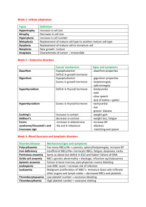Easy to read tables containing summarised information of the important points necessary for great for exam study Topic list: cellular adaption endocrine disorders Blood Dyscrasia and lymphatic disorders congenital heart disorders congestive heart failure Upper/lower Respiratory Tract infections Upper/lower GI tract disorders liver and pancreatic disorders Musculoskeletal disorders Urinary tract renal failure Chronic CNS disorders