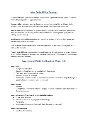 Forensic science can be incredibly complex and difficult to study. I wrote these notes to help me through the unit and I ultimately achieved a final grade of 88%. The notes are derived predominantly from the weekly lectures and the tutorials. I hope you also find them useful! These notes cover the following topics: • Key concepts of forensic science, including trace and contact evidence. • Chronological landmarks in the history of forensic science. • Legal aspects of forensic science and the admissibility of forensic evidence in the legal system. • Issues related to toxicology, drugs in racing, sport and the workplace. • Forensic application of selected modern instrumentation analysis such as Infra-Red (IR), Mass Spectroscopy (MS), High Performance Liquid. Chromatography (HPLC) and Gas Chromatography (GC). • Document Fraud and Cybercrime • Materials, firearms, fires, explosions and human remains. • Processes involved in DNA fingerprinting. Best of luck!