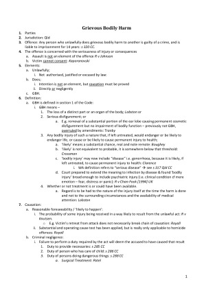 Comprehensive Criminal Law Exam Notes Easy to read and navigate in exam conditions - online and in-person Achieved a mark of 7 on the Final Exam, using these exact notes. Includes: Full case summaries for all prescribed and recommended cases All relevant information from prescribed readings All relevant provisions from the Criminal Code Contents: - Complicity (Parties) - Common Assault - AOBH - Serious Assault - GBH - Unlawful Wounding - Torture - Acts Intended to Cause GBH and other malicious acts - Negligent Acts Causing Harm - Choking, suffocation or strangulation in a domestic setting - Unlawful stalking - Stealing (and Regulatory Offences) - Robbery - Attempted Robbery - Burglary - Entering or being in premises and committing indictable offences - Receiving Tainted Property - Fraud - Unlawful Use of Motor Vehicle - Wilful Damage (and Regulatory Offences) - Arson - Endangering Property by Fire - Setting fire to crops - Forgery and Uttering - Personation - Self Defence (Minor / Unprovoked) - Self Defence (Major / Unprovoked) - Self Defence (Major / Provoked) - Provocation - Killing on provocation - Compulsion - Sudden / Extraordinary Emergency - Act independent of will - Accident - Insanity - Diminished Responsibility - Intoxication (Involuntary) - Intoxication (Voluntary) - Mistake of law - Honest Claim of Right - Mistake of law - Unknown / Unpublished Statute - Mistake of fact - Possessing dangerous drugs - Producing dangerous drugs - Supplying dangerous drugs - Trafficking dangerous drugs