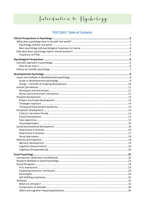 Clearly structured lecture notes in easy-to-read, tabulated format. Highlighting for important scientific experiments. Topics covered include: 1. Clinical Perspectives 2. Psychological Perspectives 3. Developmental Psychology 4. Social Psychology 5. Emotion and Motivation 6. Personality Psychology 7. Health Psychology 8. Cultural Psychology Used these notes to achieve a final HD mark of 88 overall in T2, 2020.