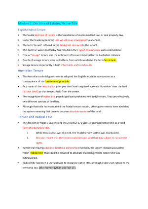 Distinction Notes for 'Real Property Law' at Victoria University in Semester 1 2020. Includes Modules on: - Native Title - Fixtures and Possession - Equitable Interests - Torrens System - Easements - Conveyancing - Co-Ownership