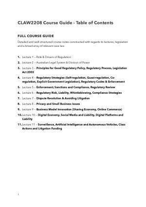 Extremely detailed and well-structured course notes for CLAW2208 for an in-depth understanding of business risk and regulation. Relevant legislation and case precedents for all core principles are clearly indicated throughout the notes in a distinct colour for ease of reference. This is highly useful for assignment research and exam preparation and performance. Course notes have been compiled from lecturer’s content and comments, tutorials and individual case research. Covers the following topics in depth: 1. Role & Drivers of Regulation 2. Australian Legal System & Division of Power 3. Principles for Good Regulatory Policy, Regulatory Process, Legislation Act 2003 4. Regulatory Strategies (Self-regulation, Quasi-regulation, Co-regulation, Explicit Government Legislation), Regulatory Codes & Enforcement 5. Enforcement, Sanctions and Compliance, Regulatory Review 6. Regulatory Risk, Liability, Whistleblowing, Compliance Strategies 7. Dispute Resolution & Avoiding Litigation 8. Privacy and Small Business Issues 9. Business Model Innovation (Sharing Economy, Online Commerce) 10. Digital Economy, Social Media and Liability, Digital Platforms and Liability 11. Surveillance, Artificial Intelligence and Autonomous Vehicles, Class Actions and Litigation Funding