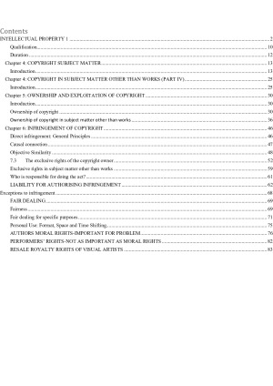 Contents INTELLECTUAL PROPERTY 1 2 Qualification 10 Duration 12 Chapter 4: COPYRIGHT SUBJECT MATTER 13 Introduction 13 Chapter 4: COPYRIGHT IN SUBJECT MATTER OTHER THAN WORKS (PART IV) 25 Introduction 25 Chapter 5: OWNERSHIP AND EXPLOITATION OF COPYRIGHT 30 Introduction 30 Ownership of copyright 30 Ownership of copyright in subject matter other than works 36 Chapter 6: INFRINGEMENT OF COPYRIGHT 46 Direct infringement: General Principles 46 Causal connection 47 Objective Similarity 48 The exclusive rights of the copyright owner 52 Exclusive rights in subject matter other than works 59 Who is responsible for doing the act? 61 LIABILITY FOR AUTHORISING INFRINGEMENT 62 Exceptions to infringement 68 FAIR DEALING 69 Fairness 69 Fair dealing for specific purposes 71 Personal Use: Format, Space and Time Shifting 75 AUTHORS MORAL RIGHTS-IMPORTANT FOR PROBLEM 76 PERFORMERS’ RIGHTS-NOT AS IMPORTANT AS MORAL RIGHTS 82 RESALE ROYALTY RIGHTS OF VISUAL ARTISTS 83