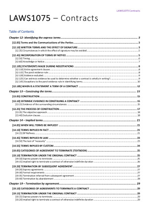LAWS1075 Contracts Detailed Textbook Colour Coded Notes Covering topics: 1A. Course overview; intro to express terms 1B. Identifying the express terms 2A. Construing the express terms 2B. Implied terms 3A. Termination 3B. Termination (continued); restrictions on termination 4A. Frustration 4B. The measure of damages 5B. The measure of damages (cont) 8B. Mistake 9A. Misrepresentation; misleading or deceptive conduct 9B. Duress; undue influence