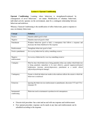 I used these notes for study and achieved a HD. I have structured notes to flow and demonstrate how concepts are built upon each other. I find tables really helpful in making study straight forward! I have left some spaces for you to write your own reflections or additional information. This document includes notes from each lecture, combined with tutorial information which was related to lectures. Lecture 1: What is learning? Lecture 2: Habituation and Sensitisation Lecture 3: Classical Conditioning Lecture 4: Connectionism Lecture 5: Applications of Classical Conditioning Lecture 6: Operant Conditioning Lecture 8: Applications of Operant Conditioning Mid-Semester Break Lecture 10: Abnormal Behaviour Lecture 11: Observational and Social Learning Lecture 12: Choice Behavioural Economics Lecture 13: Learning and addiction Lecture 14: What Learning Can Tell Us About Study