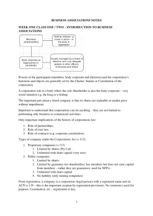 Notes covering the ENTIRE LAWS1091 course including: Introduction to business associations Limited liability Separate legal personality The corporate constitution The board of directors The general meeting Corporate contracting Directors' duties Remedies and enforcement Shareholders' remedies Winding up and administration Corporate criminal and tortious liability Team production theory of corporate law Received a Distinction with a final mark of 83 for this course.