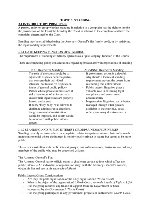 Topics Covered Jurisdiction Standing Reasons Acting outside of power (Grounds for Judicial Review I) Procedural Fairness (Grounds for Judicial Review II) Jurisdictional Error Privative Clauses Remedies Tribunals and Merits Review