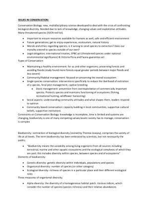 These notes cover the entire semesters worth of content, and have relevance to the field trip that is also apart of this subject. There is also many real world examples along with the key topics, allowing better application of these in the real world. Topics include; - Types of Conservation - Biodiversity - Economical implications of protecting biodiversity - Species concepts - Estimating biodiversity - Biodiversity hotspots - Types of studies - Surrogate species schemes - Mass extinction events - Protected area - IUCN Protected area categories - Overabundant native animals - Habitat fragmentation - The effect of roads - Exploitation - Invasive species - Climate change and effects on biota - Co-extinction - Private land - Conservation across borders - Sustainability - Management strategies - Genetics and conservation