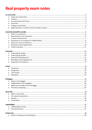 Covers all topics for exam: - Co-ownership - Easements and profits a prendre - Covenants - Leases - Mortgages - Strata Title - Indefeasibility - Priority rules