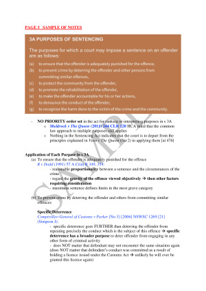 - HD quality notes, achieved HD for both the sentencing assignment and the criminal laws course (LAWS1022) - Highly detailed and UP TO DATE (Term 2 2020) notes - colour coded and includes citations and explanations + usage of all relevant sentencing cases and - complete coverage of ALL TOPICS AND DETAILS in SENTENCING modules - includes SUMMARIES and KEY POINTS of ALL CASES - includes FLOWCHARTS and DIAGRAMS for visual learners to supplement the written notes - includes also summaries on the optional supplementary coursework of sentencing podcasts and HCA opinions on parity Topics and Explanations on: - intuitive sentencing and the difference to two-stage sentencing - victim impact statement - Standard Non-Parole Period - Purposes of Sentencing - Essay points and arguments For and Against intuitive synthesis --> includes dissenting judgements of McHugh J and Kirby J in the case of Markarian - and MUCH MORE (purchased notes do NOT contain the 'SAMPLE' watermark as seen in the sample document)