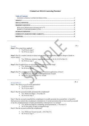 Complete flow chart to answer Criminal Law exam questions. Easy and quick overview of how to structure your answers. Flow charts are short and clear so that it is easy to follow during an exam, helping you to quickly identify what you need to answer the questions and how to begin. Contents: Answering A Criminal Law Question (Basic Steps) 1 Assault 1 Sexual Offences 2 Property Offences 2 Burglary (S 76) & Aggravated Burglary (S 77) 3 Robbery (S 75) & Armed Robbery (S 75a) 3 Inchoate Offences 3 Complicity (Participatory Liability) 4 Defences 5
