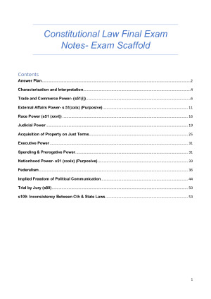 Covers all relevant materials and summarises Constitutional law perfectly. Extensive, colourful and informative notes that I wrote recently myself that scored me a HD. Has colour and diagrams to visually understand concepts and is extremely easy to navigate. I selected 7 pages from different topics to give you an idea of how my notes are set out. These notes are perfect for the Constitutional exam and will maximise your marks. Covers: Characterisation and Interpretation Trade and Commerce Power- (s51(i)) External Affairs Power- s 51(xxix) (Purposive) Race Power (s51 (xxvi)) Judicial Power Acquisition of Property on Just Terms Executive Power Spending & Prerogative Power Nationhood Power- s51 (xxxix) (Purposive) Federalism Implied Freedom of Political Communication Trial by Jury (s80) s109: Inconsistency Between Cth & State Laws
