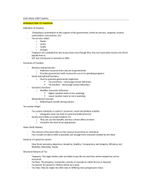 Notes on all the content outlined in taxation for sem 1, 2020 final exam. Definition of Taxation - ‘Compulsory contribution to the support of the government, levied on persons, property, income, commodities, transactions, etc.’ - Tax are also called: o Duties o Levies o Tariffs o Charges - Taxpayers are compelled by law to pay taxes even though they may not necessarily receive any direct benefit from it. - GST was introduced in Australia in 2000 Functions of Taxation - Revenue raising function o Redirects resources from citizens to government o Provides government with revenue for use in its spending programs - Social and political functions o Used to promote government objectives Tax incentives – encourage certain behaviour Tax burdens – discourage certain behaviour - Economic Functions o Modifies consumer behaviour Higher taxation leads to less spending Lower taxation leads to more spending - Redistribution function o Redistributes wealth among citizens