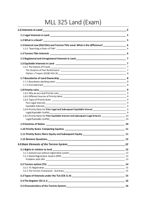It is super detailed and colour coded. It is both ready for normal in person exams and COVID exams. It includes the following topics: 1. Interests in Land 2. Basic Elements of the Torrens System 3. Exception to Indefeasibility: Statutory Fraud 4. Exception to Indefeasibility: Paramount Interests and In Personam 5. Exception to Indefeasibility: Inconsistent Legislation Exception 6. Exception to Indefeasibility: Volunteers and Assurance Fund 7. Unregistered Interests: Caveat System 8. Co-Ownership 9. Severance of a Joint Tenancy and Partition