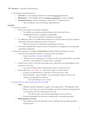 Incredibly comprehensive and extensive notes from ALL lectures and tutorials, including content from assigned readings and relevant cases. Very good notes to use a substitute for lectures. Very useful to supplement your on-call tutorials. These notes have all content from class discussions and problem questions explained. I used these notes to get 100% for tutorial participation. The notes have relevant cases explained with the material facts and judgement (see sample). These notes contain ALL topics, including: - Overview of Contracts; - Causation and Remoteness; - Damages for Breach of Contract; - Action for Debt and Penalties; - Vitiating Factors and Rescission; - Undue Influence, Unconscionable Conduct and Unfair Contracts; - Duress and Mistake; - Misrepresentation at Common Law; - Misleading or Deceptive Conduct; - Introduction to Tort Liability for Property Damage and Economic Loss; - Private Nuisance; - Tortious Interference with Goods; - Pure Economic Loss I, II & III.