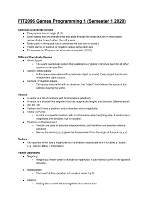 Summarized notes of all the topics from weeks 2-11 (examinable weeks) in easy to read short points. These notes are based on the syllabus in Semester 1 2020 teaching period focusing on the use of Unreal Engine 4 with C++ Topics covered: - Maths for games development – Coordinate Spaces and Vectors - Maths for games development – Matrices and Quaternions - Game Loop, time stepping, lerp and timelines - Materials, Textures, Vertices, Triangles and Polygons - Cameras and Rendering Pipelines - Physics & Collisions - UE4 Gameplay Framework & Classes - Particles & Lighting - Audio