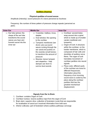 These notes are abbreviated; going over the main topics and concepts in the unit (definitions and descriptions). These are the notes I made from my detailed lecture notes, when studying for the final exam. I achieved a total mark of 91 (HD) for this subject). Notes include: Visual: light, structures of the eye, receptive fields, Gestalt grouping rules, colour perception, depth perception, attention. Audition (hearing): sound, structures of the ear, localisation of sound, qualities of sound, production of sound. Olfactory (smell): odorants, structures. Gustatory (taste): structures/receptive areas. Spatial Orientation: modalities, mechanoreceptors, thermoreceptors, nociceptors, kinaesthetic receptors, pathways to the brain, homunculus.