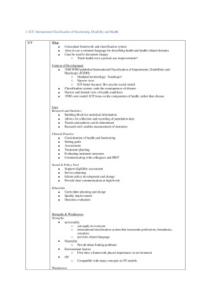 - Based on specific learning outcomes and assessable outcomes for final exam - Includes ALL 12 Weeks worth of content - Combines lecture content, tutorial content, and some readings - Format inspired by Cornell method of note taking - Grade Received: DISTINCTION INCLUDES: - Occupation and Health - ICF - Basic OT Assumptions - CMOP-E - PEO - MOHO - PEOP - Kawa - Occupational Science and Justice - Time, Tempo and Temporality - Spirituality and Health & Occupation