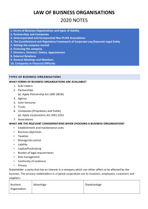 Law of Business Organisations (LOBO) is a difficult subject, especially provided that you need to be over a large number of topics and the terminology is hard to wrap your mind around. These notes helped me structure my assignments and exam as they are easy to navigate and apply. These nots include the Week 1-13 content. Use these notes alone or use them to add to your own notes! Topics included are: 1. Forms of Business Organisations and types of liability 2. Partnerships and Companies 3. Unincorporated and Incorporated Non-Profit Associations 4. The Constitutional and Regulatory Framework of Corporate Law/Separate Legal Entity 5. Getting the company started 6. Financing the company 7. Directors, Directors' Duties, Appointment 8. External Relations 9. General Meetings and Members 10. Companies in Financial Difficulty