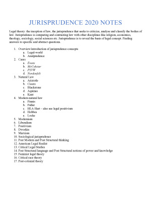 Not going to lie - this subject was one of the worst of my law degree. These notes will definitely give you a head start in understanding the topics covered in Jurisprudence. I have broken up the topics as followed: 1. Overview/introduction of jurisprudence concepts a. Legal-world b. Analprudence 2. Cases a. Evans b. McCokstar c. PYVW d. Nordenfelt 3. Natural Law a. Aristotle b. Cicero c. Blackstone d. Aquinas e. Kant 4. Modern natural law a. Finnis b. Fuller c. HLA Hart – also see legal positivism d. Hobbes e. Locke 5. Modernism 6. Liberalism 7. Positivism 8. Dworkin 9. Marxism 10. Sociological jurisprudence 11. Post Modern and Post Structural thinking 12. American Legal Realist 13. Critical Legal Studies 14. Post Structural language and Post Structural notions of power and knowledge 15. Feminist legal theory 16. Critical race theory 17. Post-colonial theory