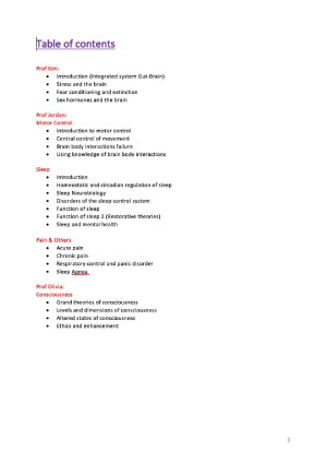 These notes cover the full subject of PSYC30020: The Integrated Brain for Semester 2, 2020. In this complete lecture notes summary, important components are highlighted in different colours (red - more important, blue - mainly for MCQs). The concepts are mostly described in words accompanied by diagrams. Each lecture starts with learning outcomes and ends with a summary. These notes helped me to achieve not only excellent scores in final exam but also H1 for the subject. I used these notes alone to learn and revise the subject repetitively for the exam. Topics Covered: Prof Kim: - Introduction (Integrated system Gut-Brain) - Stress and the brain - Fear conditioning and extinction - Sex hormones and the brain Prof Jordan: Motor Control - Introduction - Central control of movement - Brain body interactions failure - Using knowledge of brain body interactions Sleep - Introduction - Homeostatic and circadian regulation of sleep - Sleep Neurobiology - Disorders of the sleep control system - Function of sleep - Function of sleep 2 (Restorative theories) - Sleep and mental health Pain - Acute pain - Chronic pain - Respiratory control and panic disorder - Sleep Apnea Prof Olivia: Consciousness - Grand theories of consciousness - Levels and dimensions of consciousness - Altered states of consciousness - Ethics and enhancement