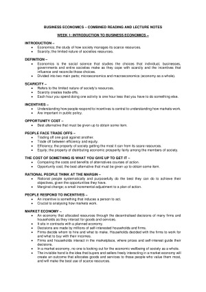 Includes weekly notes on: - Topic 1: Introduction to Business Economics - Topic 2: Accounting for the Economy - Topic 3: Economic Growth - Topic 4: Demand and Supply - Topic 5: Elasticity - Topic 6: Efficiency of Markets - Topic 7: Demand and Supply Applications - Topic 8: Externalities and Public Goods - Topic 9: Producer Choices and Constraints - Topic 10: Perfect Competition - Topic 11: Monopoly - Topic 12: Monopolistic Competition and Oligopoly