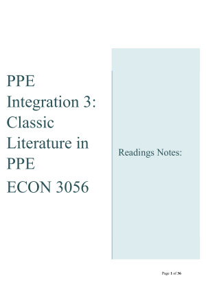 PPE Integration 3 Readings (exam and quiz prep) These notes summarise and synthesis (with page numbers and key quotes) all of the required readings of the classical literature of PPE 3. Each of the readings can be easily found with the headings in these notes. They were used in all of the weekly quizzes and the final exam where often the ideas of the reading, the author and quotes needed to be identified or explained. Well organised in weekly groups and easy to follow with clear topic headings so you can quickly search under time pressure. These notes also help you connect ideas between weeks and pick up on key themes. They also compare and contrast between the ideas of interrelated thinkers such as Keynes and Hayek.
