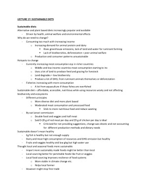 FFHP 3 notes from sem 1 2020. Excludes forums 1 and 2 since they were not examinable, also changes every year. Includes notes from: Lecture 1-2: Global Challenges to food security Lecture 3: Food, Mood and Gut Lecture 4: Pesticides and Brain Development lecture 5-6: Nutrition for Brain Health Lecture 7-8: Food Security Projects in Africa Lecture 9-10: FORUMS 1&2 - NOT INCLUDED Lecture 11-12: Women's Empowerment and Food Security Lecture 13: Sustainable Agriculture Lecture 14: Gene Technology Lecture 15-16: Food Waste Lecture 17: Sustainable Diets Lecture 18: The Growing Costs of Eating and the Nutritional Transition Lecture 19: Cellular Meat Production Lecture 20: Commercializing Alternative Proteins Lecture 21: Forum 3 - Ethics of Big Food Lecture 22: Forum 4 - Ethics in Food Production