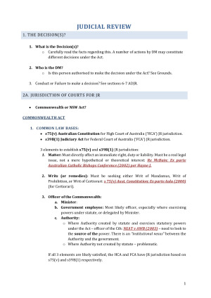 These are my concise, yet comprehensive, notes for Judicial Review AND Merits Review. Given the intense time pressure in the Admin Law final exam, I spent several hours specifically making these notes so that I could easily and quickly answer exam problem questions whilst also ensuring that my responses were detailed enough to achieve a high D/HD grade. Please have a look through the preview to check out the quality of the notes for yourself. I believe that you will find these notes very useful not only for the final exam but also for the assignment, saving you stress and (more importantly) hours of your precious time! Judicial Review Topics: the Decision; Jurisdiction of Courts; Justiciability; Standing; Grounds of Judicial Review (all grounds covered in detail); Jurisdictional Errors (all types covered in detail); Remedies; Delegated Legislation; Privative Clauses. Merits Review Topics: AAT Jurisdiction; Standing; Process / Procedure; Outcome / Remedy; Basis for Appeal (Content); Appeal from AAT Decision. NB: Please be aware that these notes do not cover the other remaining topics in the course on which you may receive essay questions in the exam. Please see my full course notes (also available for sale on this site) for comprehensive well-structured notes on these topics.