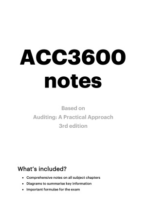 These notes were carefully crafted and used throughout the semester and the final exam to score 90% on the unit. Included in this document you will find: • Comprehensive notes on all chapters used in the subject (Auditing: A Practical Approach, Moroney, et. al) • Diagrams to summarise key information • Important formulae for the exam Please enjoy these notes and good luck for the unit. I hope you find it as enjoyable as I did!