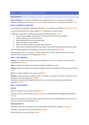 Topic 2: Incorporation and its effects • Registration • Separate Legal Entity Doctrine • Corporate group - Application of Salomon Principles • Lifting the corporate veil o At common law o By statute o Section 588G – duty to prevent insolvent trading • Corporate groups and related companies Topic 3 – Types of companies • Proprietary Company • Public Company • Member’s liability • Corporate Groups Topic 4 – Constitution and Replaceable Rules • Constitution & Replaceable Rules • Company Powers, object clauses and abolition of ultra vires • Effect of constitution as a ‘statutory contract’ • Alteration of constitution – statutory limits • Alteration of constitution – equitable limits Topic 5 – Share capital, debt capital and dividends • How do companies obtain capital? • Share capital/equity o Issuing shares o Calling on shares o Classes of shares o Variation of class rights • Reducing share (equity) capital o Reductions o Buy backs (?) – double check it’s in the reading guide! • Financial Assistance • Dividends • Debt capital Topic 6 – Directors, Member and Corporate Decision Making • Division of power • Board of Directors o Who is a director and how are they appointed o Types of directors/officers o Resignation, retirement, removal of directors o Disqualification regime o Directors’ meetings and decision making • Members o Who are members? o Ceasing to be a member o Meetings, voting and shareholder resolutions and statements o General meeting disclosure obligations o Decision making without a general meeting o Procedural irregularities Topic 7 – Corporate Contracting • Direct execution • Indirect execution • Common law assumptions o Indoor management rule • Actual authority • Apparent/ostensible authority • Statutory Assumptions Topic 8 – Directors’ Duties • Duty to act in good faith and in the best interests of the company • Duty to exercise powers for proper purposes • Duty not to fetter discretion • Duty to avoid conflicts of interest o Conflict rule, profit rule o Duty not to misuse one’s position and company information o Disclosure of personal and material interests o Related party benefit regime • Duties of care, skill and diligence o Historical standards o Current standards o Defences Business judgement rule Reliance on information provided by others Delegation • Duty to prevent insolvent trading (s 588G) Topic 9 – Consequences of breach of DD and relief from liability • Consequences for General law duties • Consequences for statutory duties • Statutory criminal penalties • Exoneration by the company • Relief by the courts Topic 10 – Members’ remedies • Members’ remedies • Statutory derivative action • Oppressive conduct • Winding up orders • Statutory injunctions • Personal Actions • Other statutory rights Topic 11 – Corporate Mortality • Overview and aims of administration regime • Receivership • Voluntary administration • Liquidation & Winding Up • Deregistration