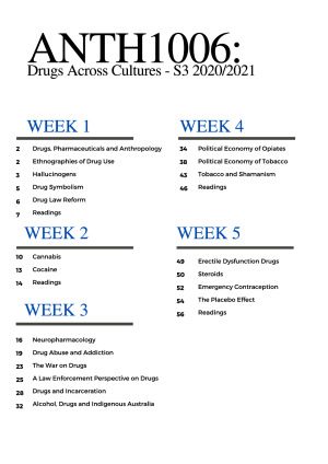 These are very comprehensive and detailed notes that I used to achieve a mark of 87 (HD) in Session 3 2020. It includes notes for the entire course content + a summary of required readings (which often tend to be very long and asked in quizzes), as well as the lecture notes. The lectures tend to be long and interesting; however, lecture slides often don’t include some important things that the lecturers mention (and which tend to be quiz questions) so I have made sure to include these crucial details in my notes. The topics included are: Drugs, Pharmaceuticals and Anthropology Ethnographies of Drug Use Hallucinogens Drug Symbolism Drug Law Reform Cannabis Cocaine Neuropharmacology Drug Abuse and Addiction The War on Drugs A Law Enforcement Perspective on Drugs Drugs and Incarceration Political Economy of Opiates Political Economy of Tobacco Tobacco and Shamanism Erectile Dysfunction Drugs Steroids Emergency Contraception The Placebo Effect (+ the required readings)