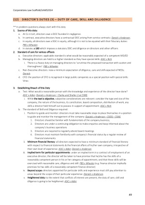 These notes are exam-ready comprehensive scaffolds that you can just run through in order to address every issue in a problem question. It saves you the time of reading through vast amounts of legislation and cases by referencing all the relevant principles/tests to the exact legislation/case. They breakdown the large amount of content in this unit to exactly what you need to address in a problem question to secure a good mark. These are pretty much the only notes you will need to bring into a corporations law exam and the clear content breakdown makes the complex content easy to understand by linking the topics to each other. Topics included: 1) Introduction 2) Company Formation 3) Corporate Fundraising (seminar 3 only) 4) Corporate Insolvency 5) Corporate personality and limited liability (Corporate Criminal Liability) 6) Corporate Constitution 7) Corporate Decision-making organs 8) General Liability in Contract and Tort (Corporate Contracting) 9) Directors' Duties: Duty to act in good faith and proper purpose 10) Directors' Duties: Duty to avoid conflict between duty and interest 11) Directors' Duties: Duty of care, skill and dilligence 12) Members' Rights and remedies
