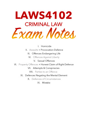 I. Homicide II. Assaults + Provocation Defence III. Offences Endangering Life IV. Offences Against Liberty V. Sexual Offences VI. Property Offences + Honest Claim of Right Defence VII. Attempts & Conspiracies VIII. Parties to an Offence IX. Defences Negating the Mental Element X. Defences of Circumstances XI. Mistake