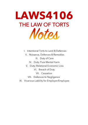 I. Intentional Torts to Land & Defences II. Nuisance, Defences & Remedies III. Duty of Care IV. Duty: Pure Mental Harm V. Duty: Relational Economic Loss VI. Breach of Duty VII. Causation VIII. Defences to Negligence IX. Vicarious Liability for Employer/Employee