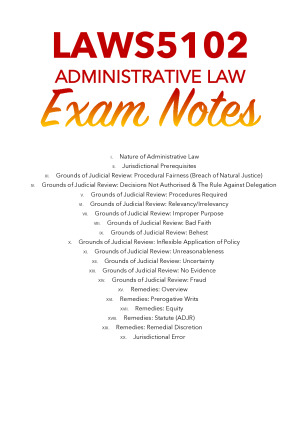 I. Nature of Administrative Law II. Jurisdictional Prerequisites III. Grounds of Judicial Review: Procedural Fairness (Breach of Natural Justice) IV. Grounds of Judicial Review: Decisions Not Authorised & The Rule Against Delegation V. Grounds of Judicial Review: Procedures Required VI. Grounds of Judicial Review: Relevancy/Irrelevancy VII. Grounds of Judicial Review: Improper Purpose VIII. Grounds of Judicial Review: Bad Faith IX. Grounds of Judicial Review: Behest X. Grounds of Judicial Review: Inflexible Application of Policy XI. Grounds of Judicial Review: Unreasonableness XII. Grounds of Judicial Review: Uncertainty XIII. Grounds of Judicial Review: No Evidence XIV. Grounds of Judicial Review: Fraud XV. Remedies: Overview XVI. Remedies: Prerogative Writs : Equity : Statute (ADJR) XIX. Remedies: Remedial Discretion XX. Jurisdictional Error