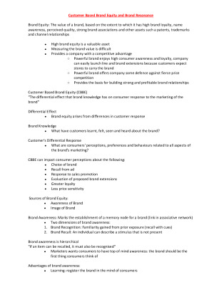 Notes from MKF2521, Semester 2 2020. HD Unit score Covers: - Customer Based Brand Equity and Brand Resonance - Brand Positioning - Brand Elements - IMC and Leveraging Secondary Associations - Brand Z - Brand Extensions and Branding New Products - Reinforcing, Revitalising and Retiring Brands - International Brand Management - Conducting a Brand Audit - Branding Trends - Questions and answers for exam prep