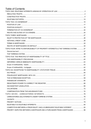 These highly detailed and structured notes cover the following topics: TOPIC ONE: EQUITABLE INTERESTS ARISING BY OPERATION OF LAW TOPIC TWO: CO-OWNERSHIP TOPIC THREE: MORTGAGES TOPIC FOUR: INTRO TO ENFORCEABILITY OF PROPERTY INTERESTS & THE TORRENS SYSTEM TOPIC FIVE: THE PRINCIPLE OF INDEFEASIBILITY OF TITLE TOPIC SIX: EXCEPTIONS TO INDEFEASIBILITY: STATUTORY FRAUD TOPIC SEVEN: UNREGISTERED INTERESTS