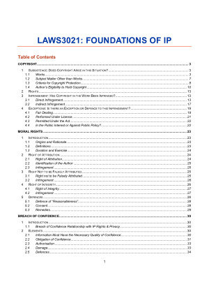 These are a comprehensive set of notes that are COLOUR CODED and CONCISE and perfect for the EXAM. I used these notes to achieve an overall mark of 86 in TRIMESTER 3 2019. These notes have been updated for the trimester system and are a concise but detailed summary of class notes, handouts and textbook readings. The notes have been formulated to best aid the online Moodle tests that were worth 80% of the overall mark. As you will see in the sample—each section begins with a quick summary of the relevant steps to apply in a problem question scenario inclusive of authority. The notes cover: 1. Copyright 2. Moral Rights 3. Breach of Confidence 4. S 18 Misleading and Deceptive Conduct 5. Passing Off 6. Trademarks 7. Designs They follow the structure of the classes and will be an incredibly useful asset for class participation as the classes usually did not require doing pre-readings prior to attending class but involved a lot of thinking on the spot type questions. Having these notes which set out simple examples as well as the relevant authority and definitions will make CP a breeze.