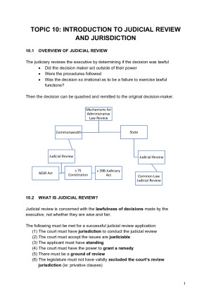 Covers lectures 9-17 included in the exam: (1) Delegated Legislation (2) Intro to Judicial Review; Jurisdiction (3) Justiciability; Standing (4) Remedies (5) Errors of Law (6) Procedural Fairness (7) Consideration; Purpose (8) Identity of Decision Maker (9) Grounds of Review; Privative Clauses
