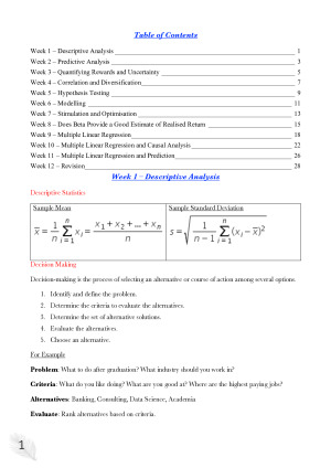 These are well-condensed but detailed notes on each topic to help prepare for final exams and complement your study for Financial Metrics for Decision Making at University of Technology Sydney. The following notes contain diagrams and information to help clearly understand Financial Metrics for Decision Making 25624 and includes notes from all lectures, tutorials and THE TEXTBOOK. Specifically, the following topics are covered: Week 1 – Descriptive Analysis Week 2 – Predictive Analysis Week 3 – Quantifying Rewards and Uncertainty Week 4 – Correlation and Diversification Week 5 – Hypothesis Testing Week 6 – Modelling Week 7 – Stimulation and Optimisation Week 8 – Does Beta Provide a Good Estimate of Realised Return Week 9 – Multiple Linear Regression Week 10 – Multiple Linear Regression and Causal Analysis Week 11 – Multiple Linear Regression and Prediction Week 12 – Revision Note: The sample notes contain approximately 10% of the complete notes.