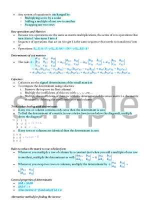 These notes thoroughly cover all lecture content from the entire course - for the final exam. Notes include but are not limited to the following topics: 2D coordinate system 3D coordinate systems 2D and 3D: Describing Lines and planes Scalars and Vectors Trigonometry Formulas Vector Components Magnitude of a Vector Representing Vectors Multiplication by a Scalar Vector Addition/Subtraction: Head-Tail Method Position Vectors Standard Basis Vectors Addition/subtraction of vectors – add/minus the components Unit vectors The Vector Dot product Work and the Dot product The Dot product Properties of the Dot product Proofs Scalar Projections Vector projections Torque and The Cross Product (aka The Vector product) Factors Affecting Torque (Γ) Cross Product - Geometrically & Properties Scalar Triple Product – Geometric Significance Equation of a line Description of a Line Segment General Equation of a plane Cartesian Equation of a plane Lines of intersection of non-parallel planes Differential Calculus assumed knowledge Continuity and differentiability Differentiation rules Product and quotient rules Chain rule Errors and small approximations, or Differentials Numerical Methods: Newton’s Method The Exponential Function The Trigonometric Hyperbolic Function Properties of the Hyperbolic Functions Derivatives of hyperbolic sine, hyperbolic cosine and the hyperbolic tangent functions Complex Numbers Complex Conjugate and Modulus Polar Coordinates Converting from Polar to Rectangular form Exponential Forms of complex numbers Exponential polar form De Moivre's Theorem Finding roots of complex numbers Inverse functions The Logarithm Function Review of log laws Logarithmic Differentiation Derivatives associated with the inverse hyperbolic functions Integrals associated with the inverse functions Derivative of complex numbers Primitive Functions Sum of Power Series Other properties of a definite integral Fundamental Theorem of Calculus Applications: using integration to find a length Applications: using integration to find a second moment of area Application: average value of a function Numerical Integration - Trapezoidal Rule Applications: using integration to find work done in the context of springs The substitute rule Change of Variable Integration by Parts Integrals in the form of ∫▒〖a polynomial/another polynomial dx〗 Integration by Partial Fractions Integrals with quadratic denominators that have no linear factors Differential Equations Number of arbitrary constants and definition of general solutions Order of A Differential Equation (DE) Linearity Solving Differential Equations: the method of "Separation of Variables" Exponential Growth and Decay Solving first order linear DES: the integrating factor method Applications Solving second order linear DEs, with constant coefficients Differentiation is linear The principle of superposition Method for solving linear second order DE's with constant coefficients Roots of the Auxiliary Equation and Associated Solution of the DE Method of Variation of Parameters (case 2 theory) Case 3 Theory Spring Mass System Model Spring model - damping Solutions of the DE: y'' + 2γy' + ω2y = 0 Inhomogeneous Case The Method of Undetermined Coefficients Matrices Rules of addition Multiplication by a scalar Matrix Operations: Matrix multiplication Identity matrix - matrix equivalent of the number 1 Transpose matrix The inverse of a 2x2 matrix Summary: rules of matrix algebra Determinants Finding the inverse of a 3x3 matrix Row operations and Matrices Determinants of 3x3 matrices Cofactors Tricks when dealing with determinants Rules to reduce the matric to row-echelon form General properties of determinants Alternative method for finding the inverse Cramer's Rule - solving equations Linear system of equations Sequences, series and applications Sequences Limit of sequences Finding limits of sequences that involve polynomials and fractions of polynomials Sigma notation and convergence of series Convergence of series by looking at partial sums Important facts about Convergence of series The ratio test: a test for convergence of series Power Series Finding intervals of convergence of power series