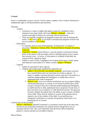 These notes are very detailed and got me an HD in the subject. Lots of cases and legislation which are all highlighted for ease when using. Contains the following topics: tort law intro and theory, trespass of person + goods, conversion, trespass to land, nuisance, defences to intentional tort, duty of care, intentional torts, duties for special parties, standard of care and breach, damage causation and remoteness, challenges to causation, concurrent liability, defences to negligence,